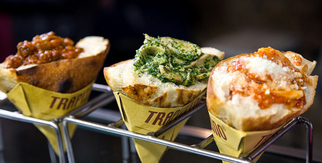Testaccio, Ponte Milvio e Piazza Cavour, tre locali che abbracciano Roma e che danno la possibilità ai suoi avventori di provare questa gustosa idea di Stefano Callegari. Tutto nacque nel 2008 a Testaccio e in pochi anni Trapizzino diventa un punto di riferimento per lo street food romano. La missione è quella di far conoscere ai più giovani i piatti della tradizione avvolti in un soffice trapezio di pizza bianca.